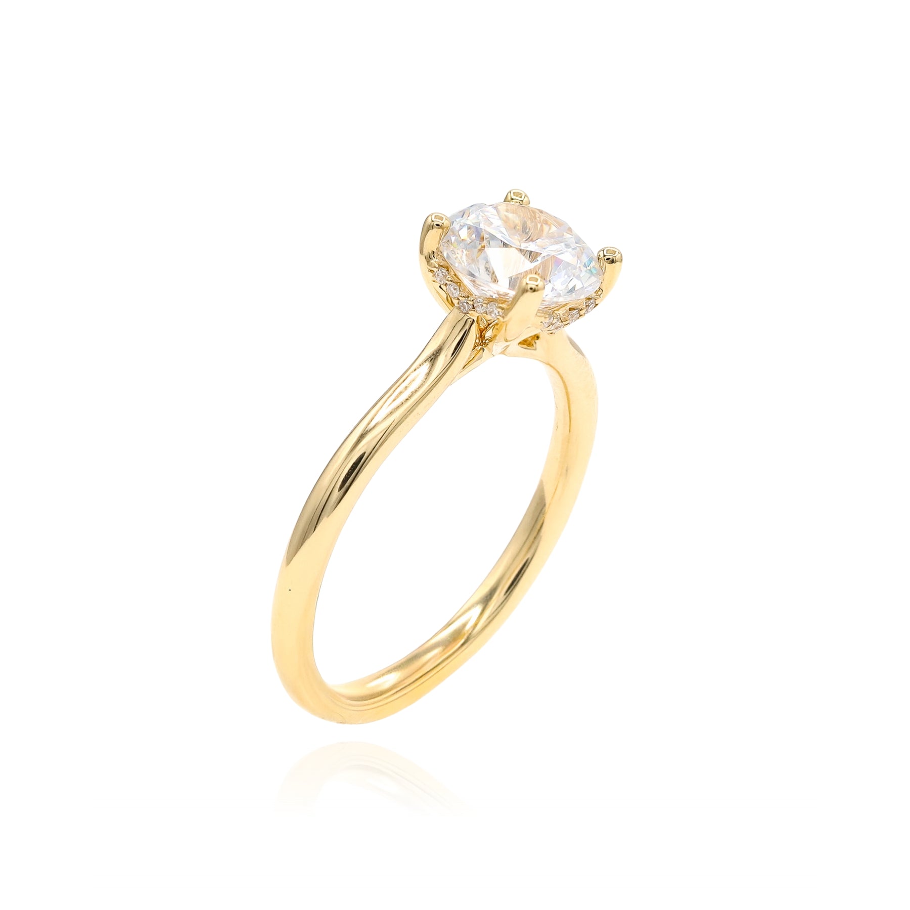 14k yellow gold 4-prong solitaire engagement ring mounting with hidden halo gallery containing 20 round diamonds totaling-0.04ctw, size 6.5. Shown with a 1.00ct CZ center - SETTING ONLY.
