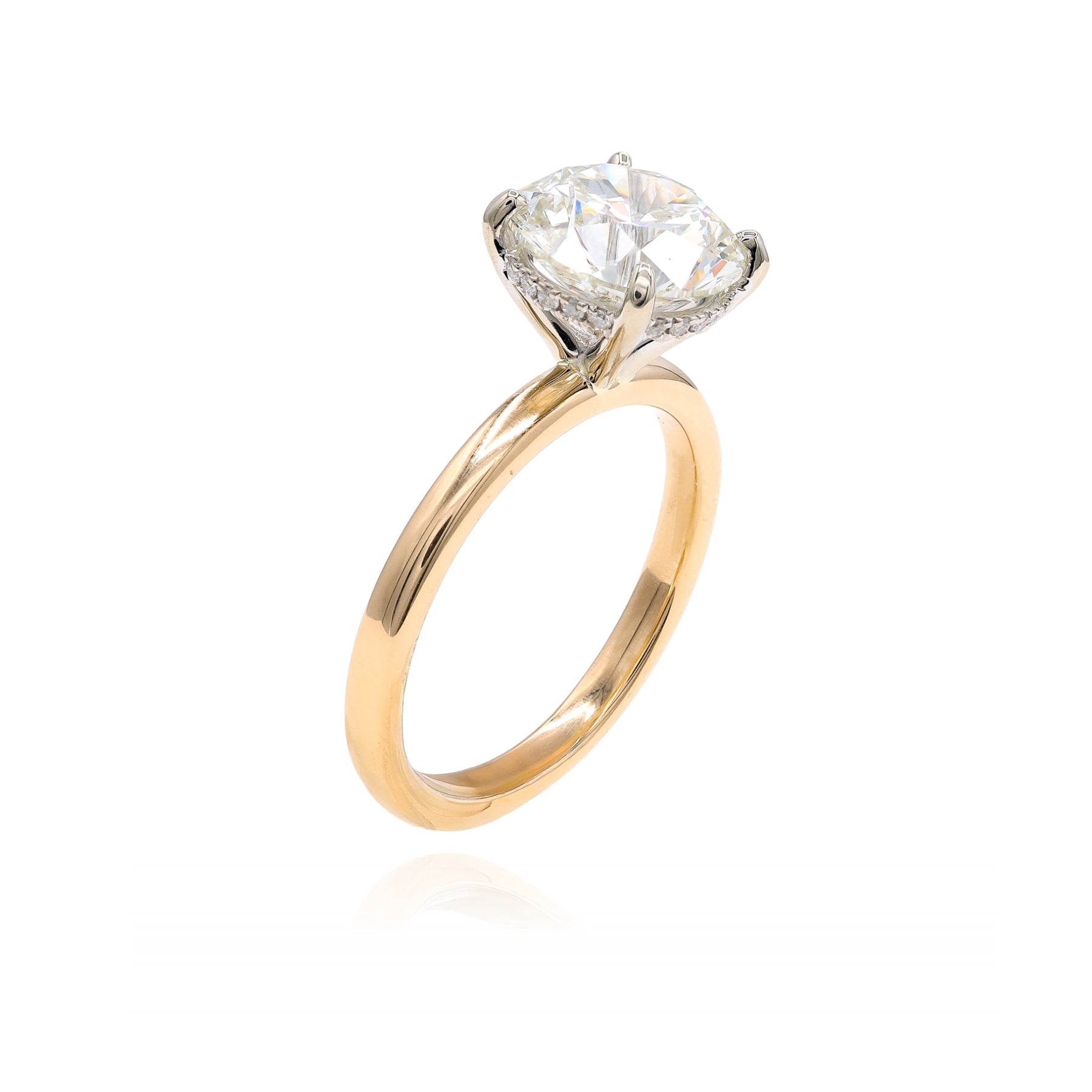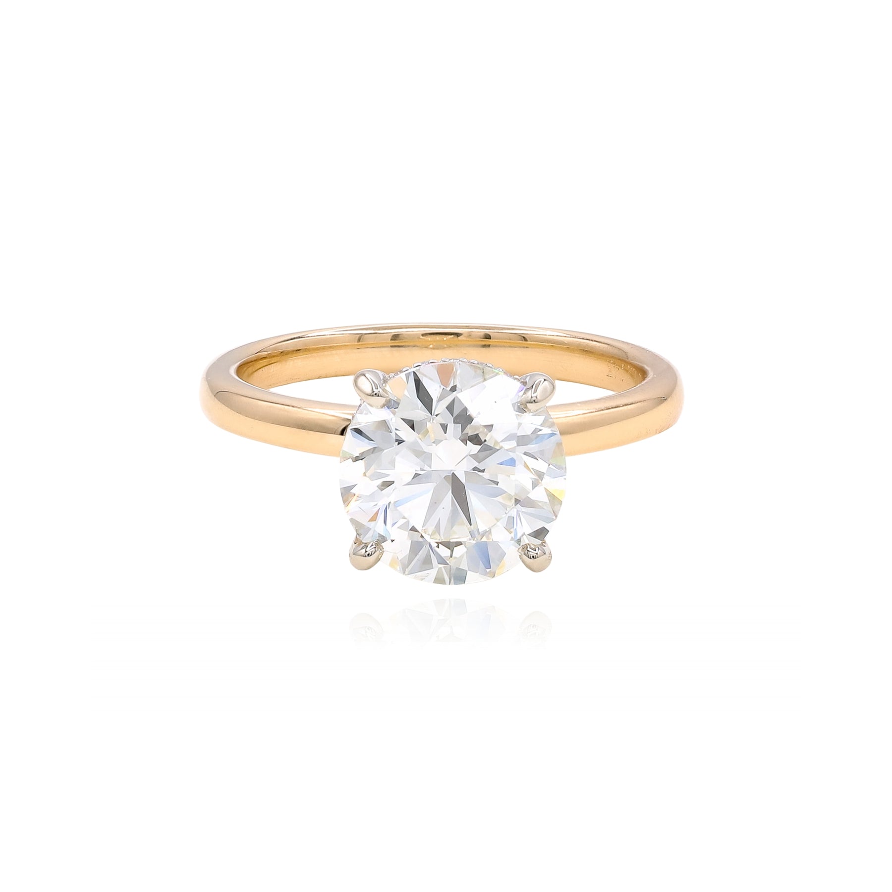 14K yellow gold solitaire engagement ring with a 3.03ct round brilliant cut diamond (J color, SI2 clarity, GIA report #6535631525, laser inscribed) and hidden halo containing-0.07ctw, size 6.5.