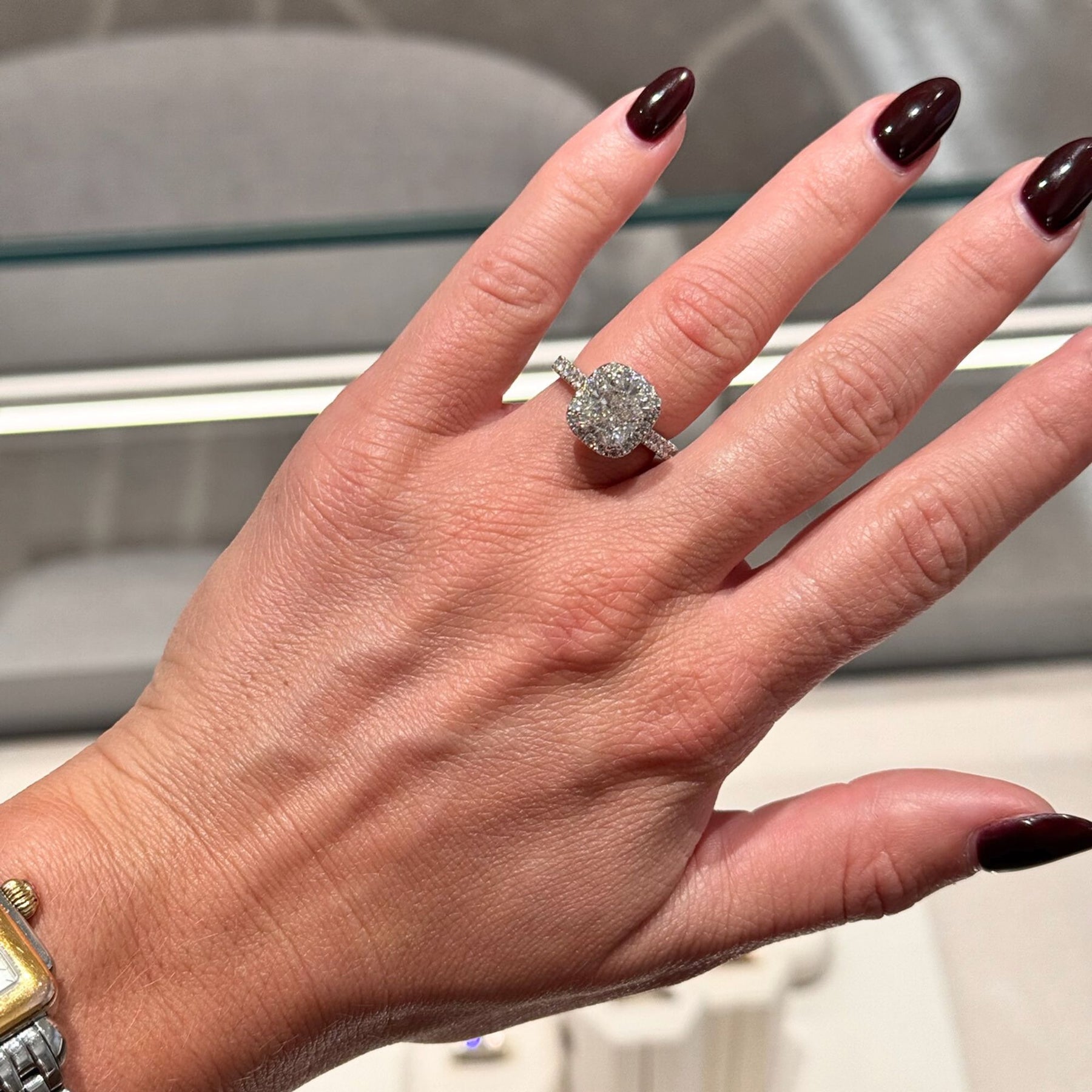 Platinum Henne-fit cathedral style ring with diamond halo containing a cushion cut diamond 3.01ct H color SI1 clarity GIA report # 6213422670 laser inscribed and 34 diamonds 0.82ctw G to H color VS2 to SI1 clarity ring size 6.00US.
