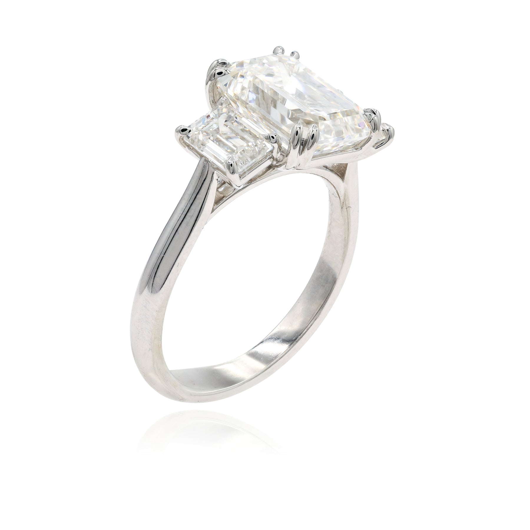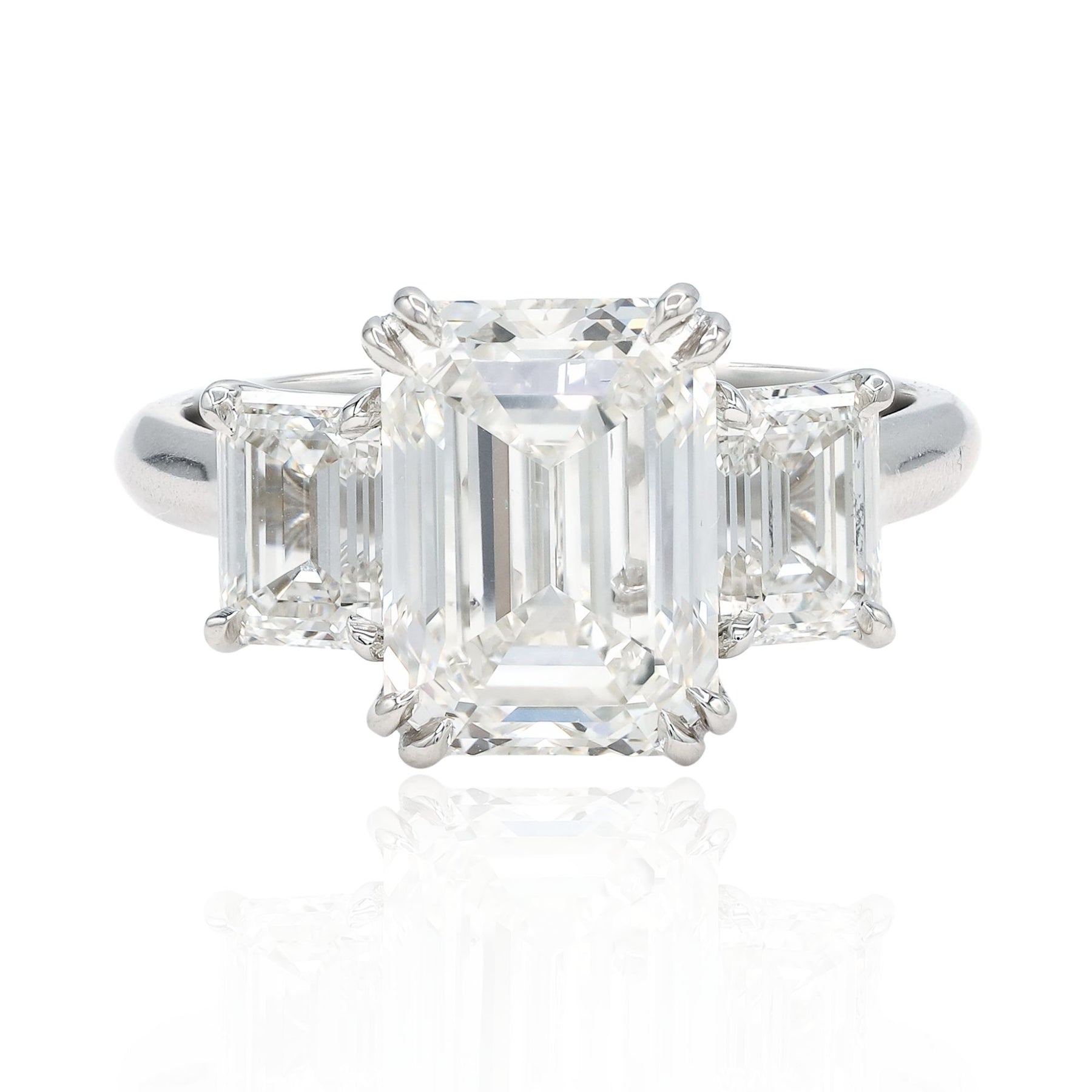 Platinum 3-stone 'Henne-Fit' ring containing center 4.01ct emerald-cut diamond (H color, VS2 clarity, GIA report #2195886020) and 2 emerald-cut diamonds weighing 1.40ctw (H color, VVS1-VS2 clarity, GIA#6197585762/5192702748), size 6.50.