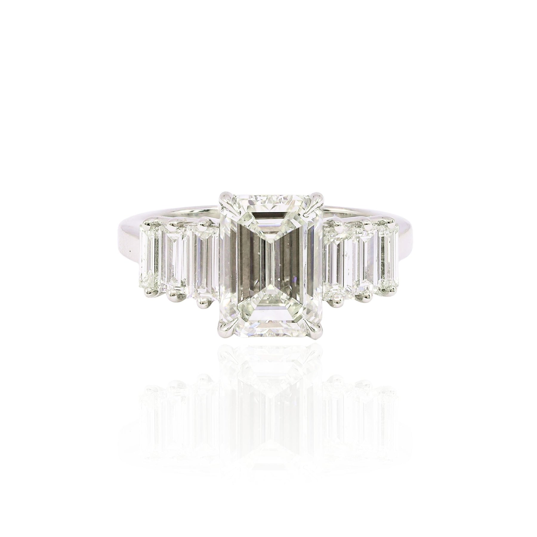 Platinum ring containing a 3.00ct emerald cut diamond J color VS2 clarity GIA Diamond Grading Report #6495379169 (laser inscribed) and 6 baguette cut sides totaling 0.86ctw I-J color VS clarity