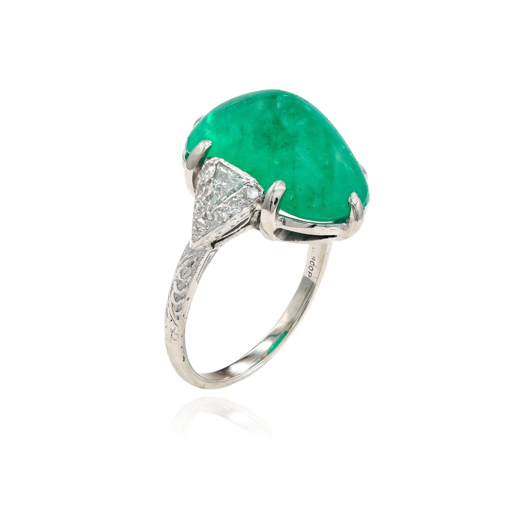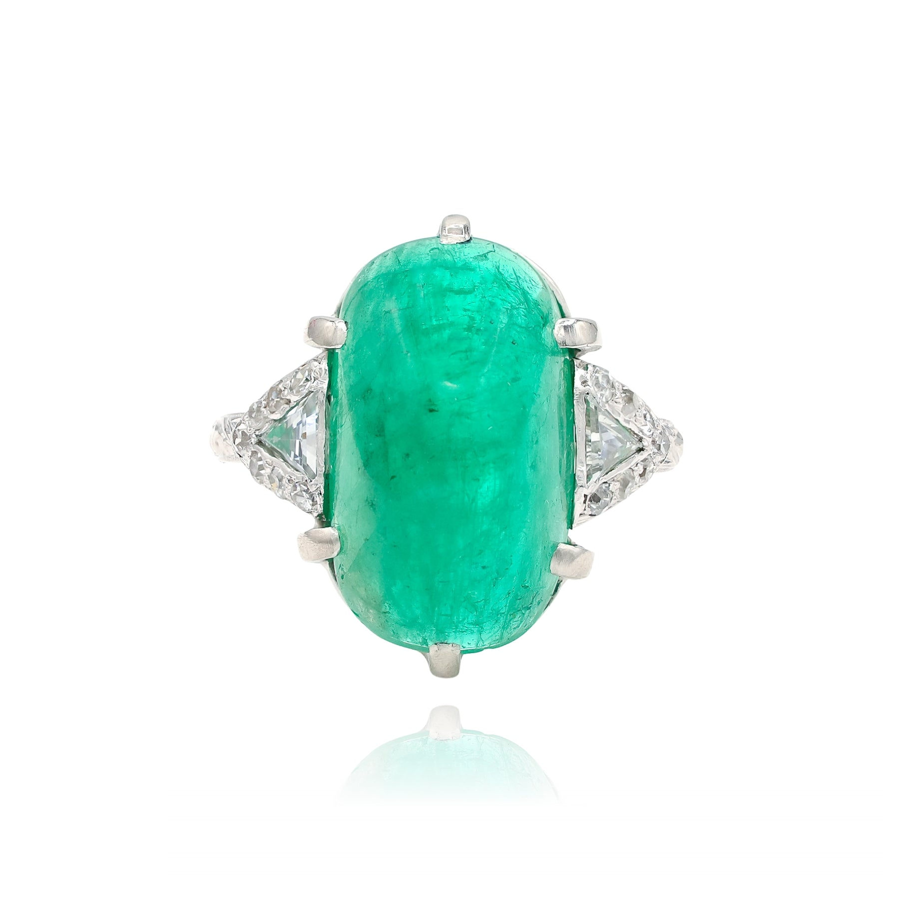 Estate Art Deco platinum cabochon emerald and diamond ring with a 16.5x9.5x7.9mm emerald weighing approximately 8.50 carats (minor oil treatment F1) with 2 triangle cut diamonds and 14 single cut diamonds weighing 0.25ctw. Note one chipped diamond.