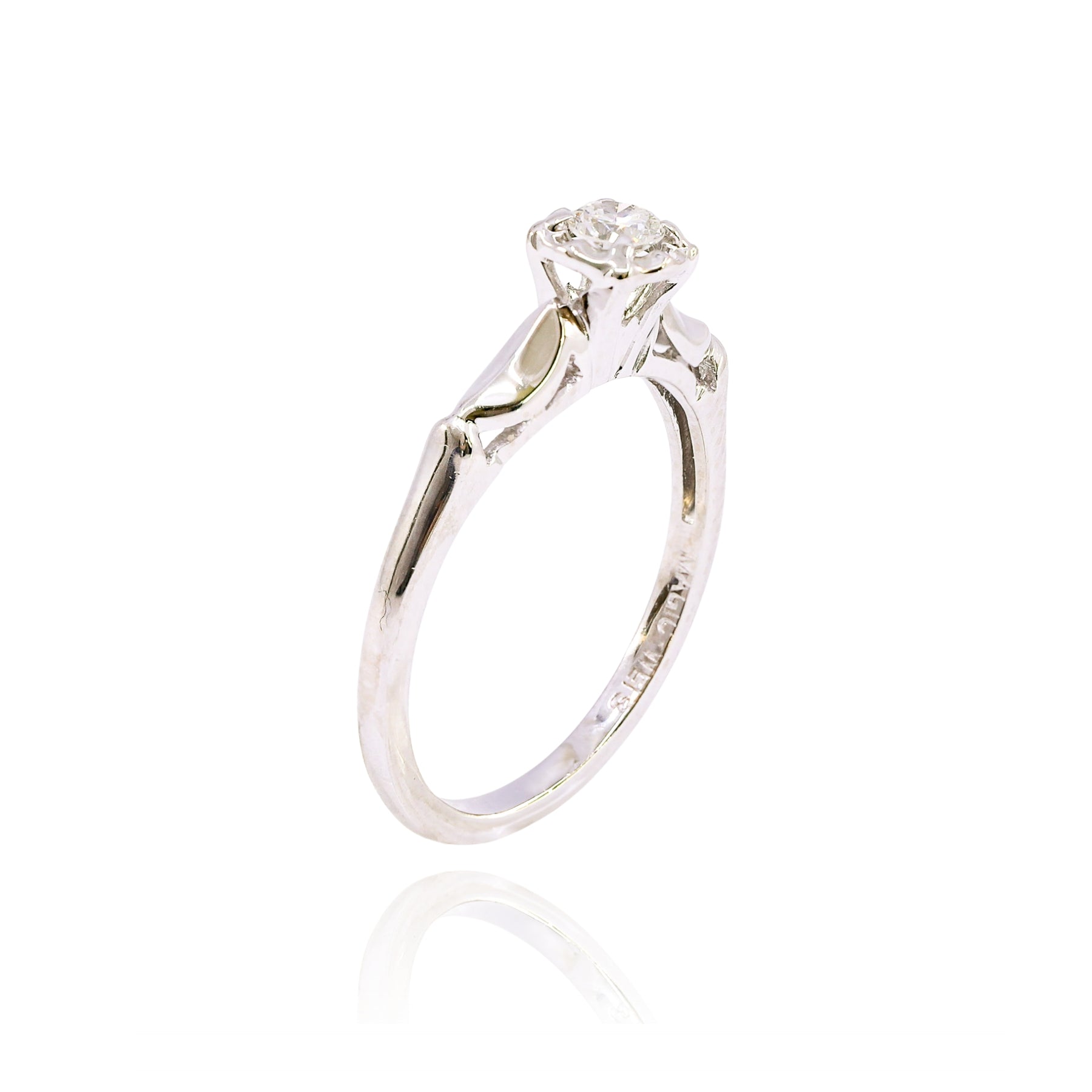 Estate 14K white gold vintage engagement ring containing 0.18ct round brilliant diamond (H color, VS1 clarity), size 6.00.