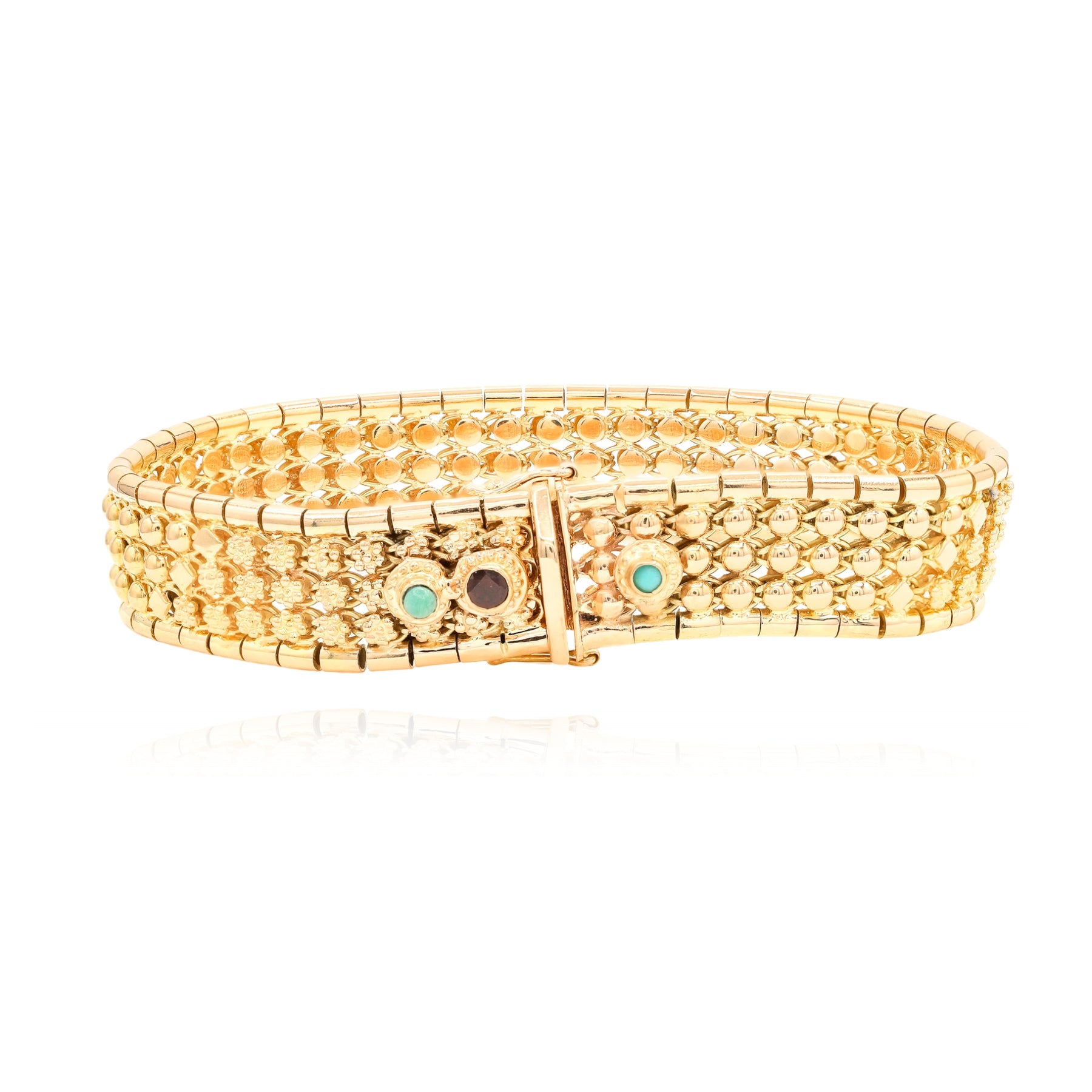 Estate 18K yellow gold 7 inch ball, diamond shape and flower sectioned link bracelet accented with round 2mm turquoise, round 2.3mm turquoise and 2.7mm round garnet. Valued at $9,300.