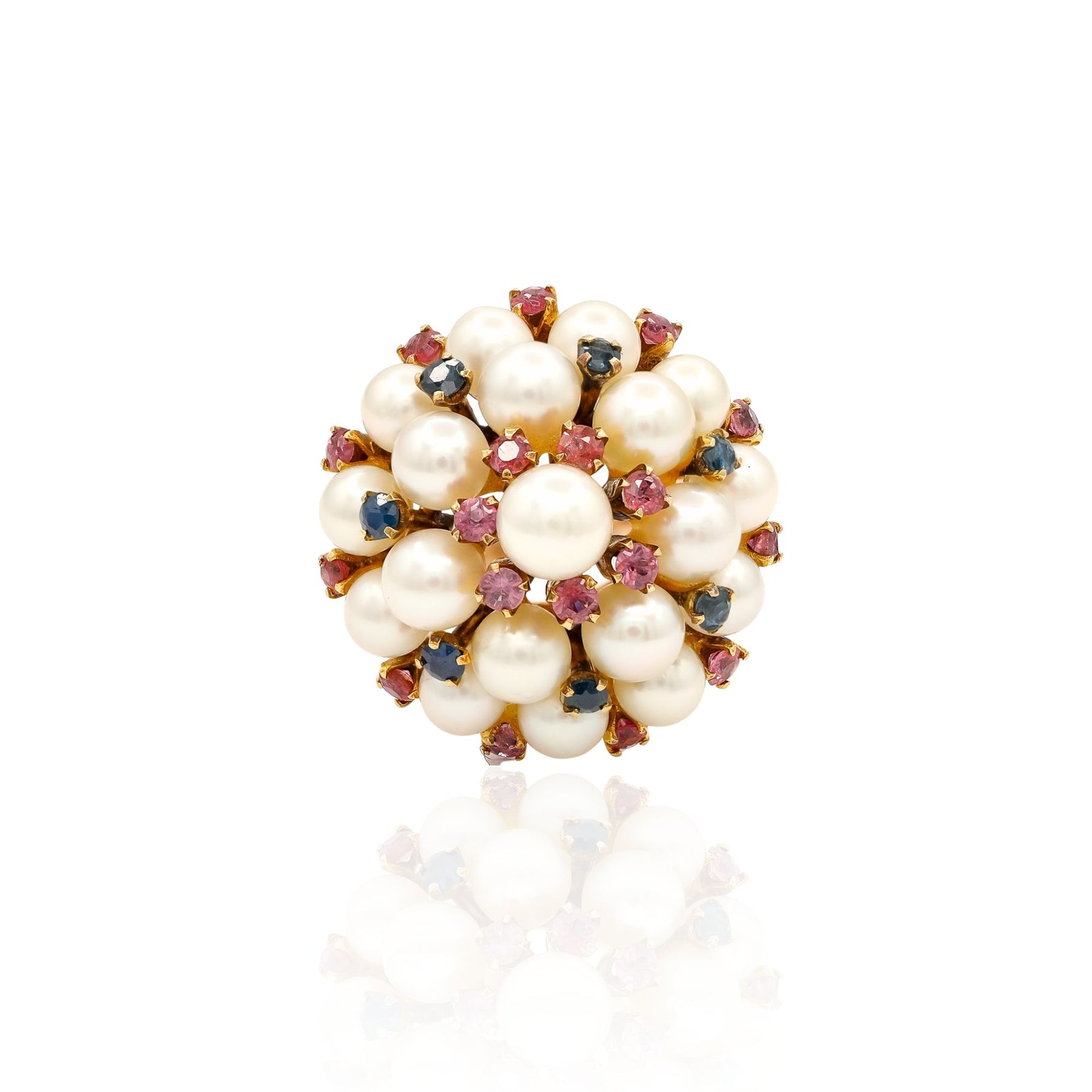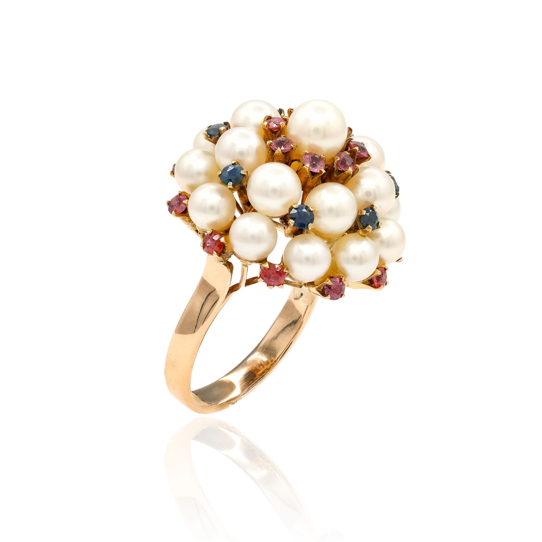 Estate Vintage Pearl and Sapphire Cluster Ring 14KY