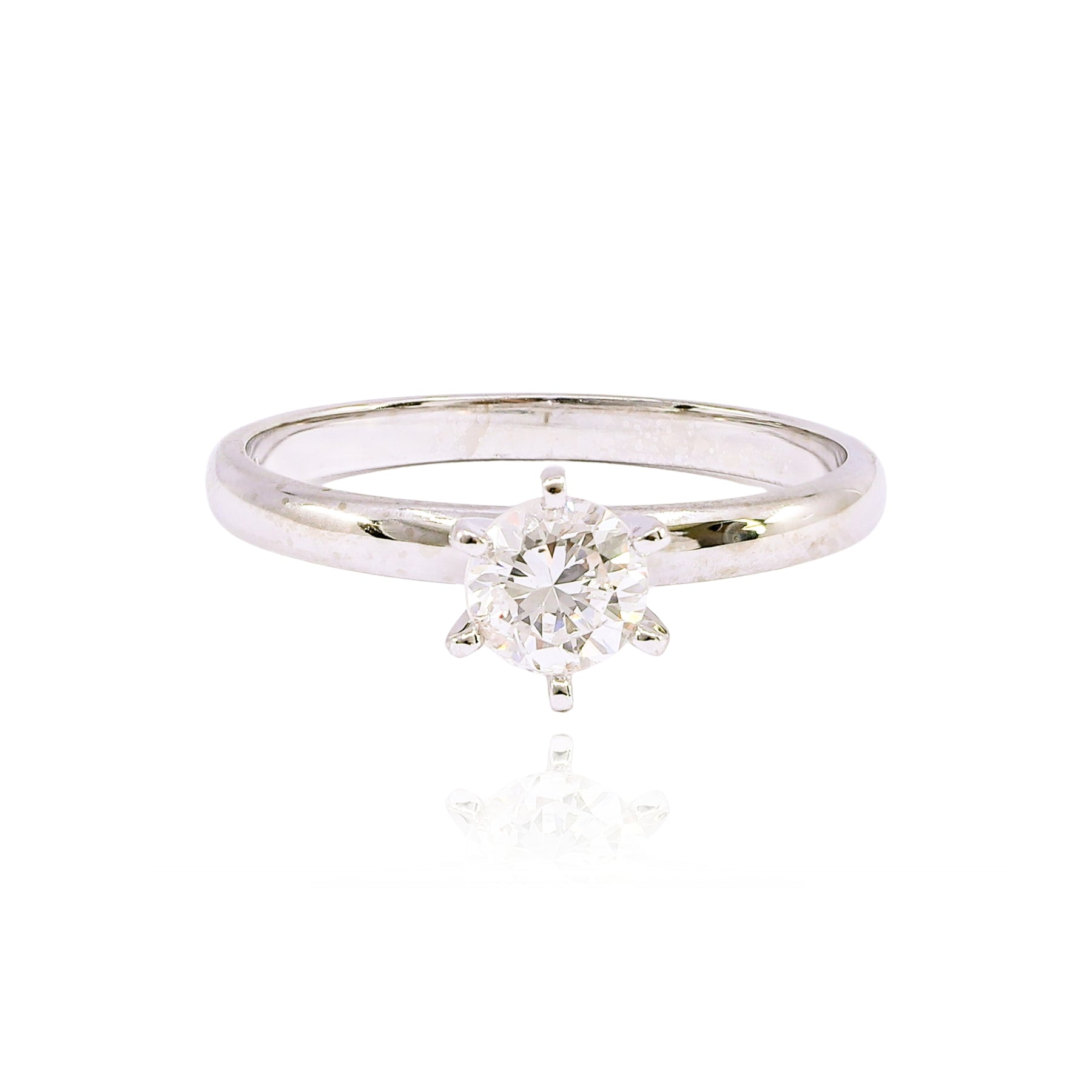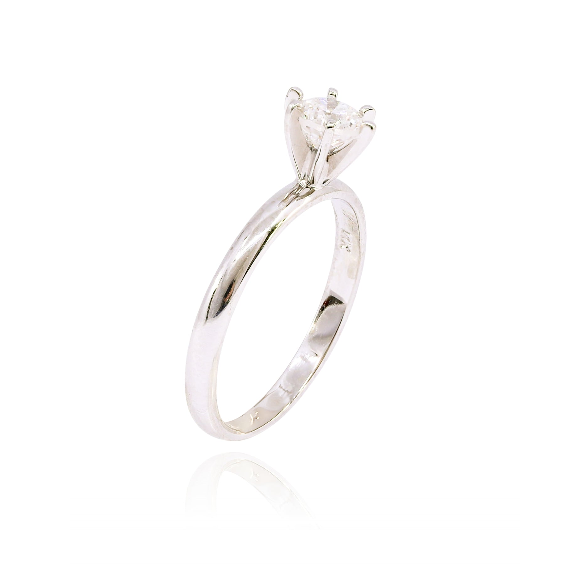Estate 14K white gold 6-prong solitaire engagement ring containing 0.45ct round brilliant diamond (G color, I1 clarity), size 6.00. Valued at $1,200.