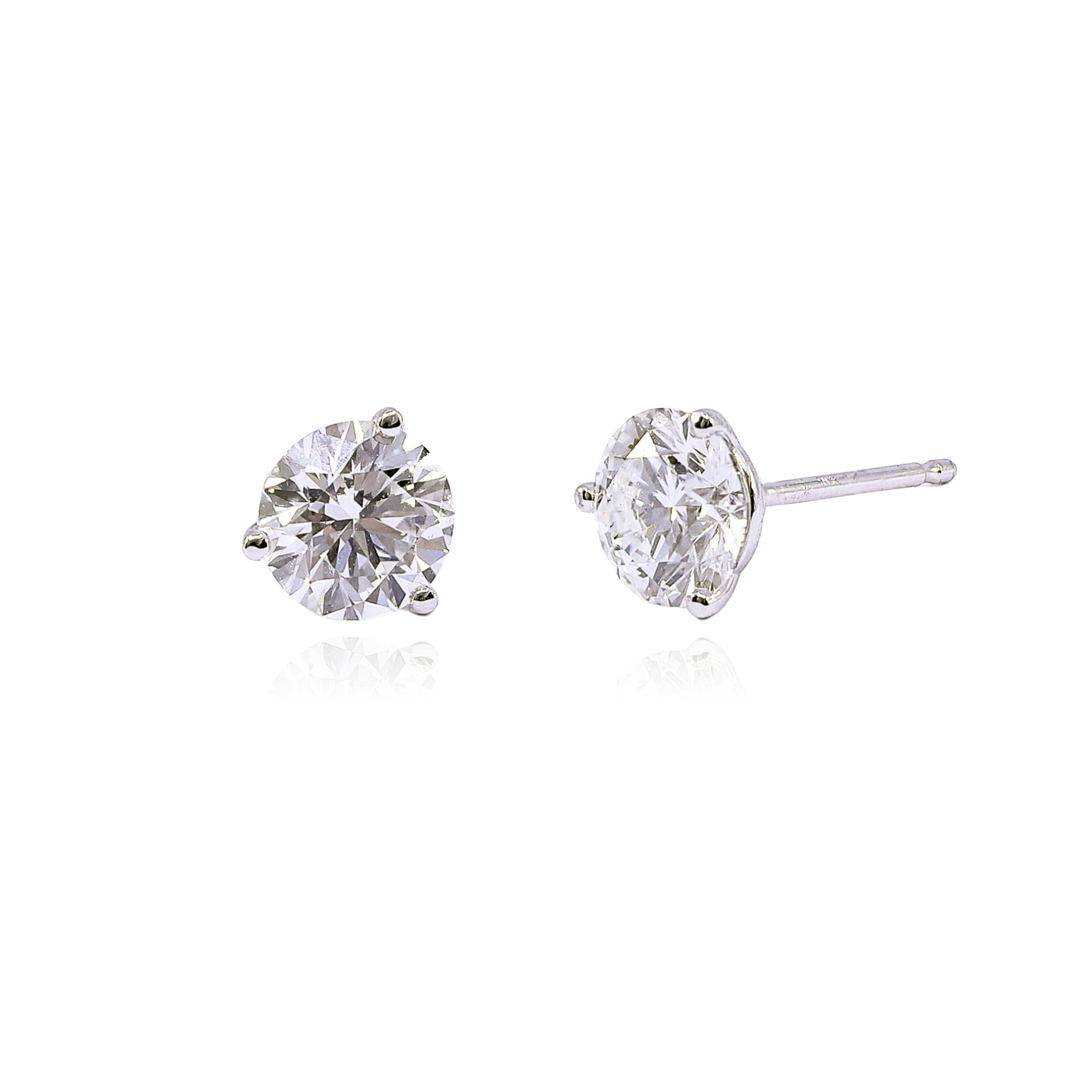 14K white gold 3-prong pierced earrings set with two round brilliant cut diamonds weighing 1.54CTW, I-J color, SI1-SI2 clarity