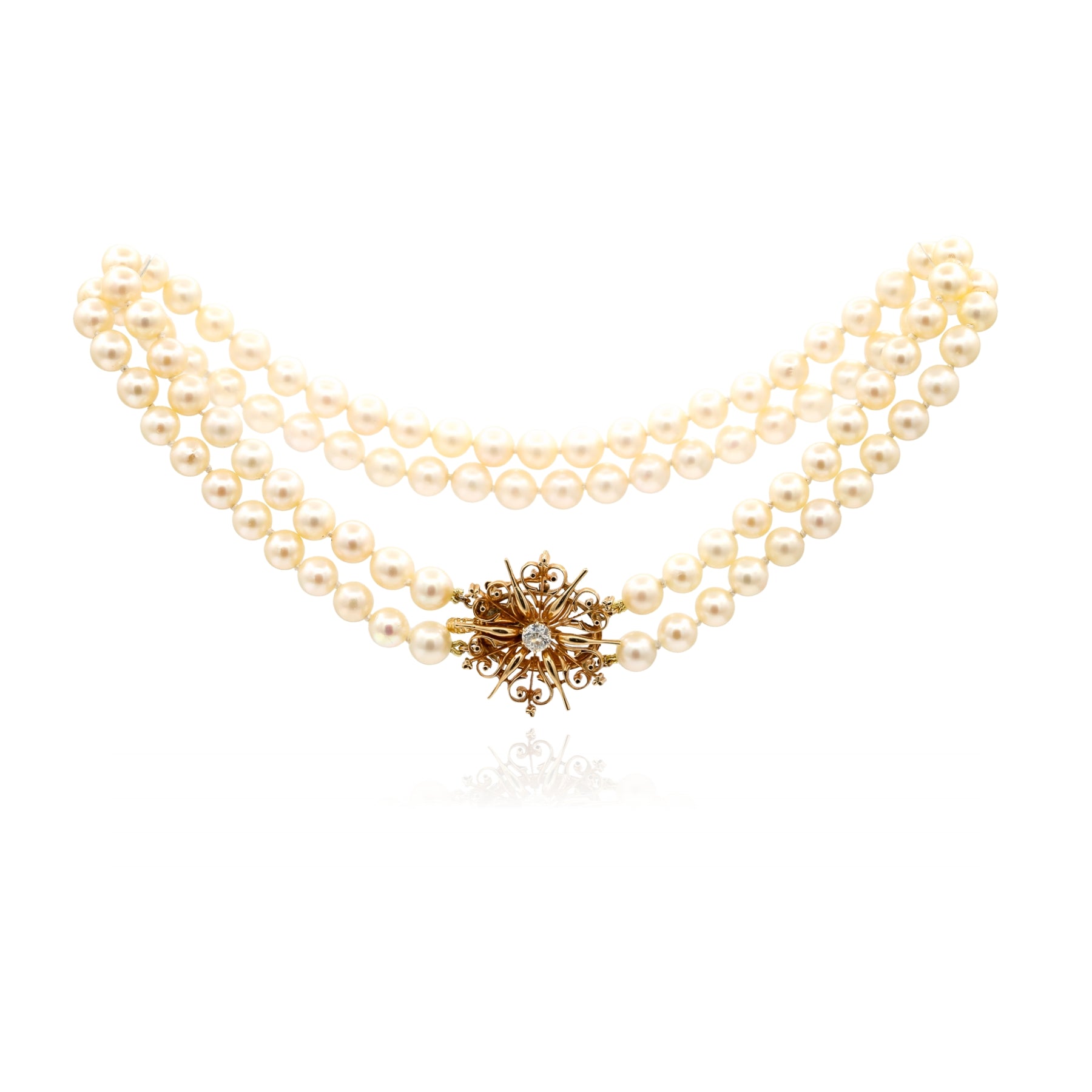 Estate 15-inch 2-strand 7-7.5mm pearl necklace with 14K yellow gold filagree clasp and center 0.42ct round brilliant diamond (J color, SI2 clarity). Valued at $3,650.