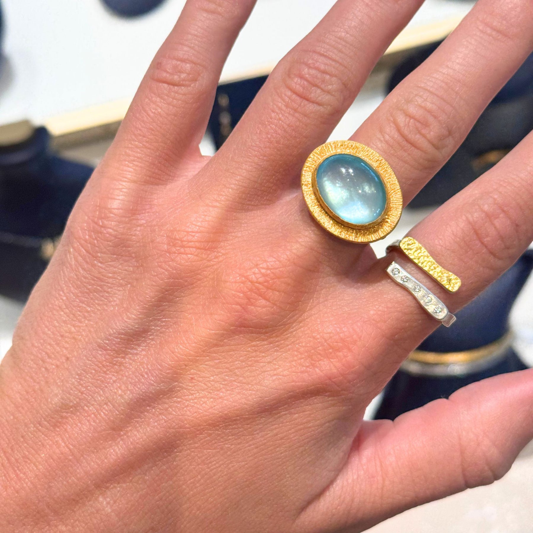 Lika Behar hammered fusion 24K yellow gold and matte sterling silver ‘Pompeii’ cabochon blue topaz doublet ring-9.18ctw, size 6.5