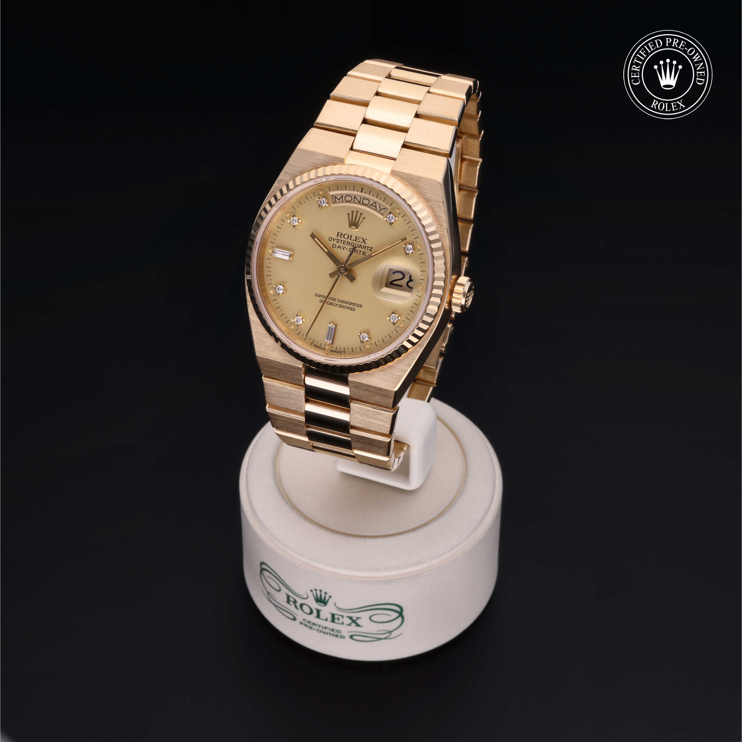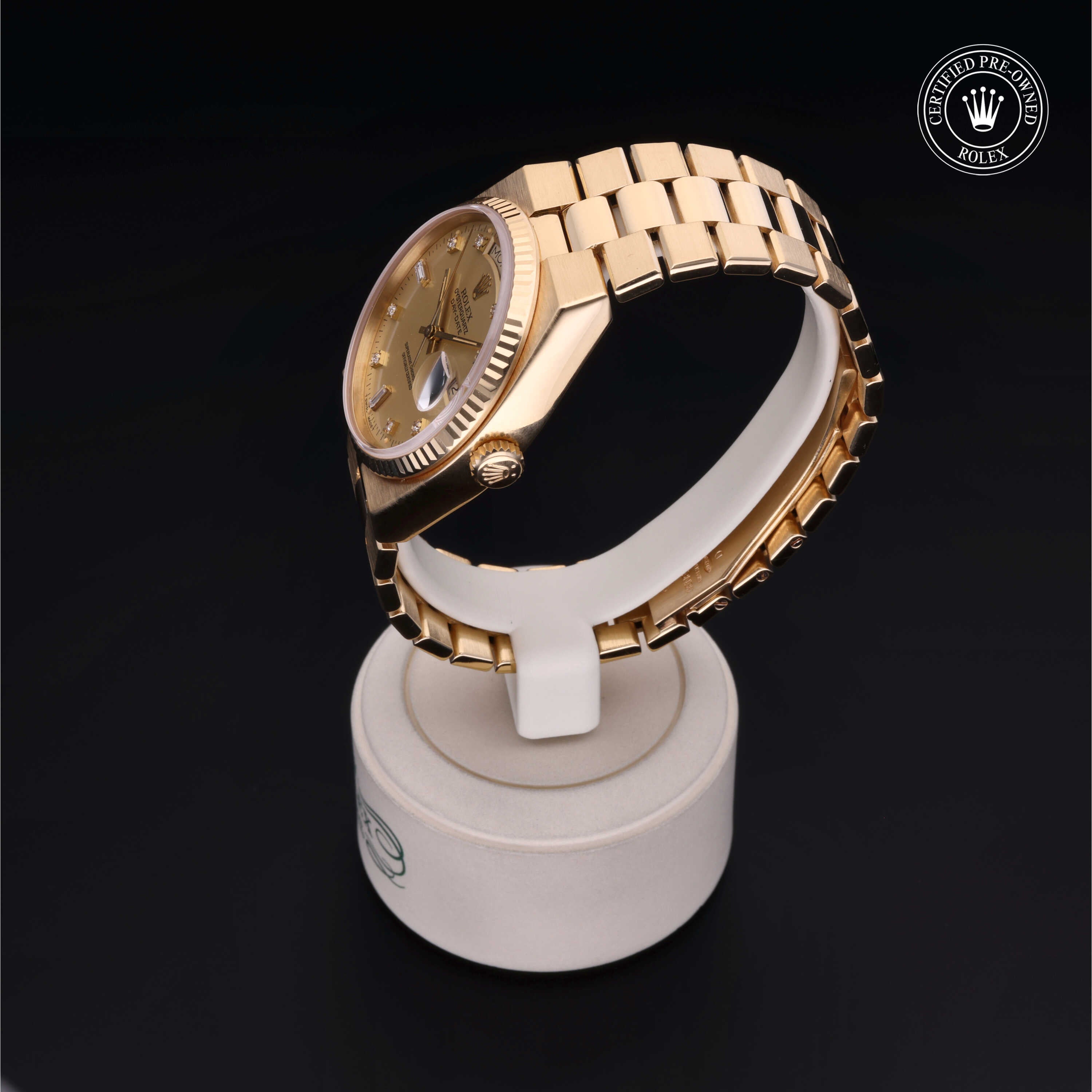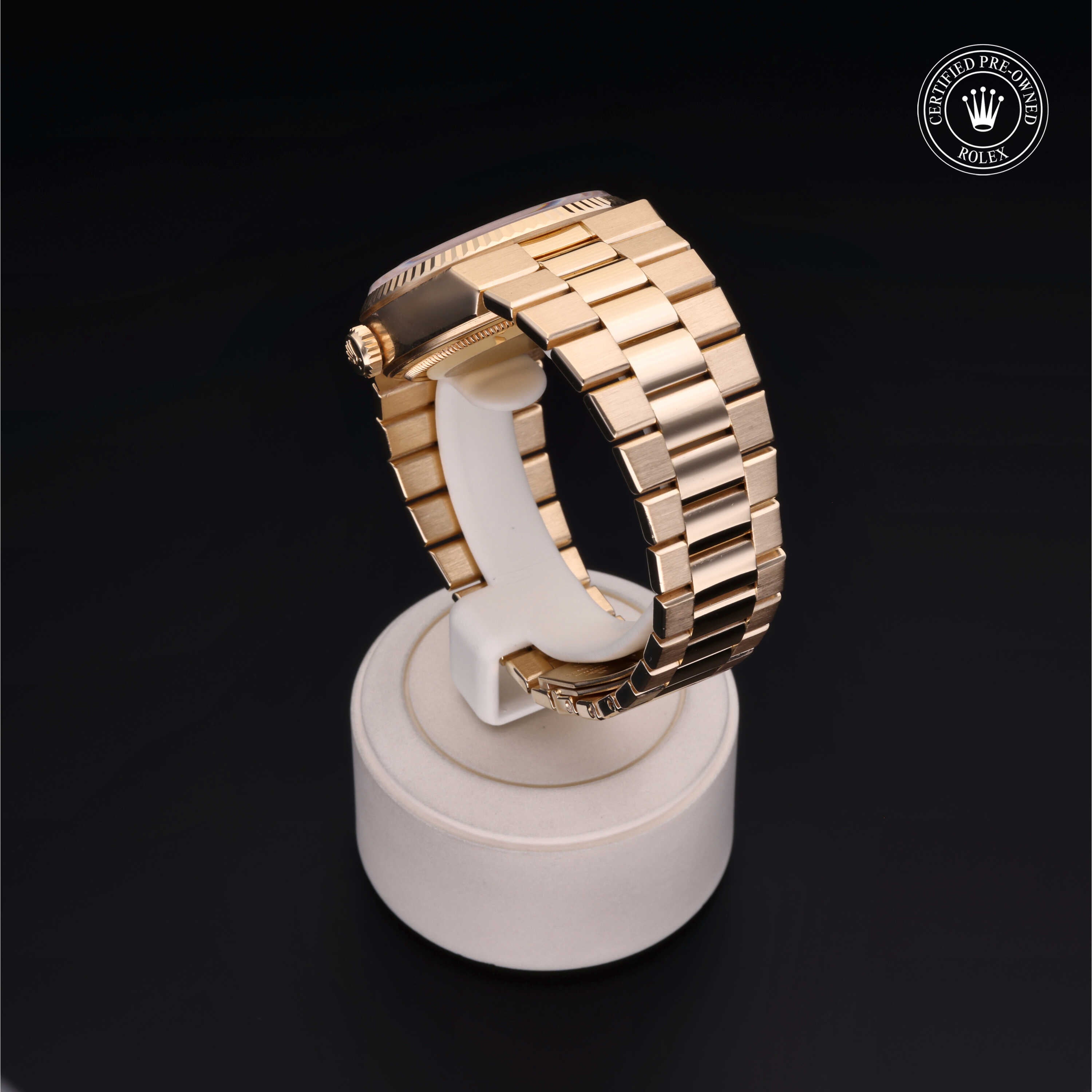 The Oyster Perpetual Day-Date, available only in 18 kt gold or 950 platinum, embodies the essence of Rolex prestige and excellence.