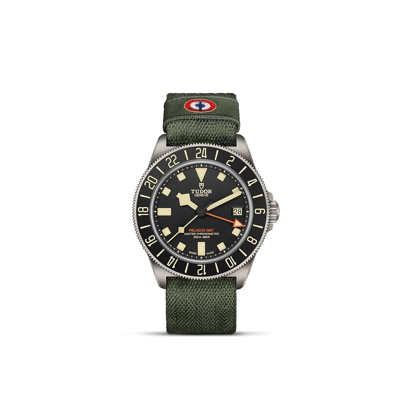 Bracelet | Green one-piece fabric strap with titanium pin buckle and keeper. Extra removable fabric keeper with the French Naval Aviation roundel |