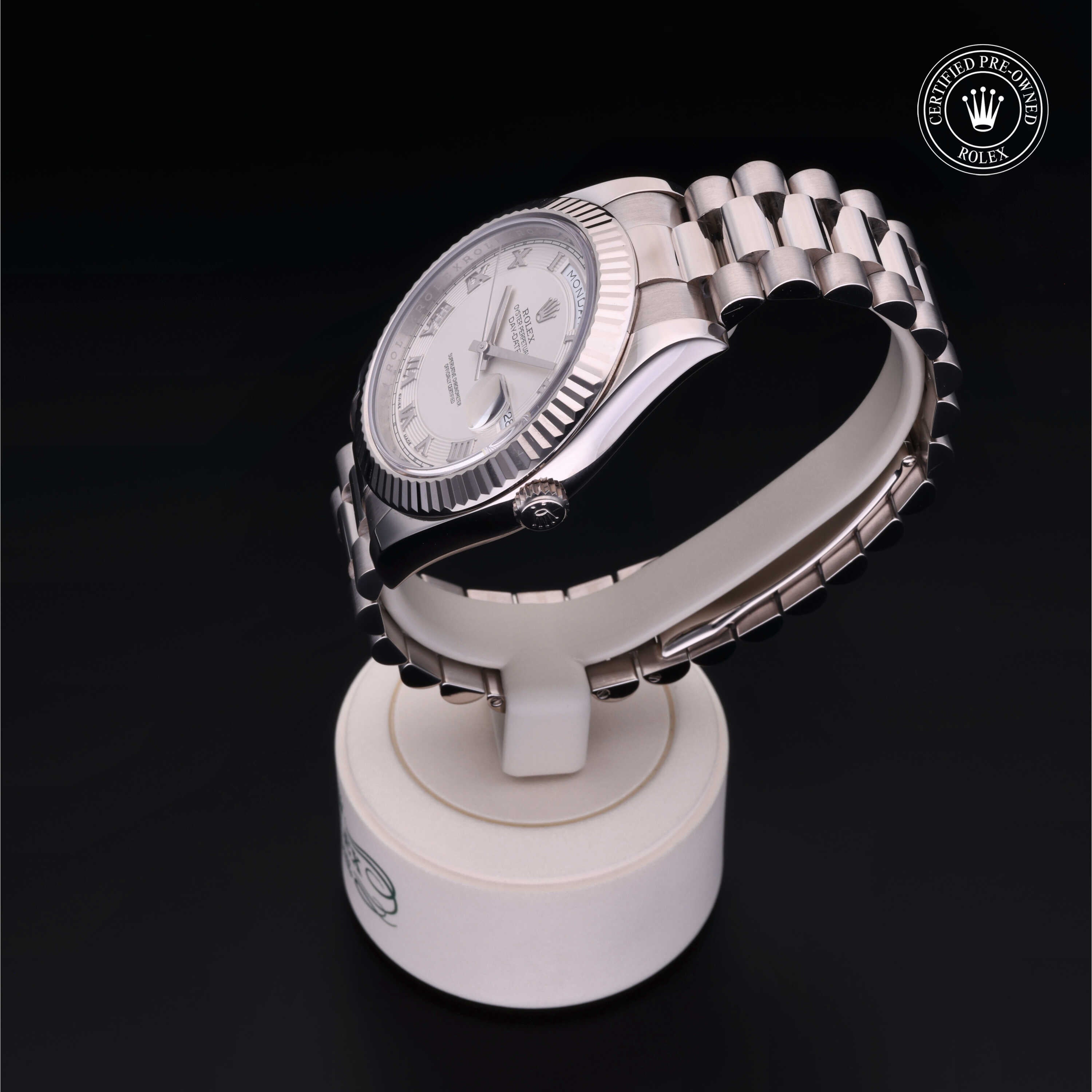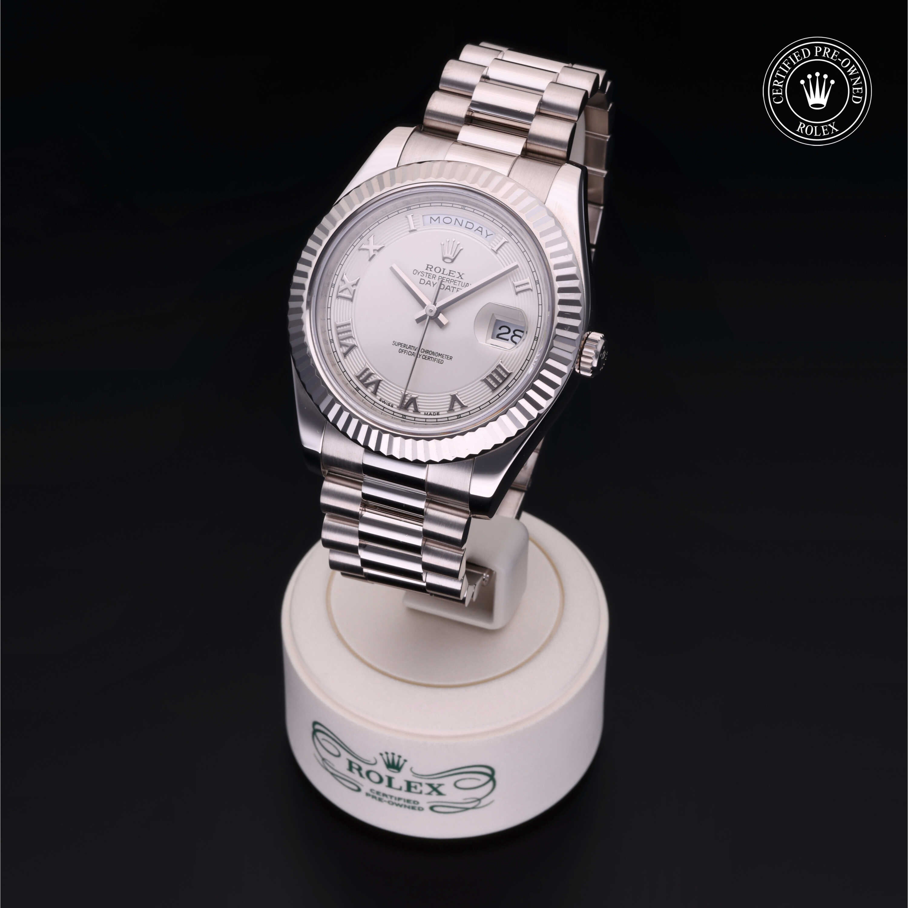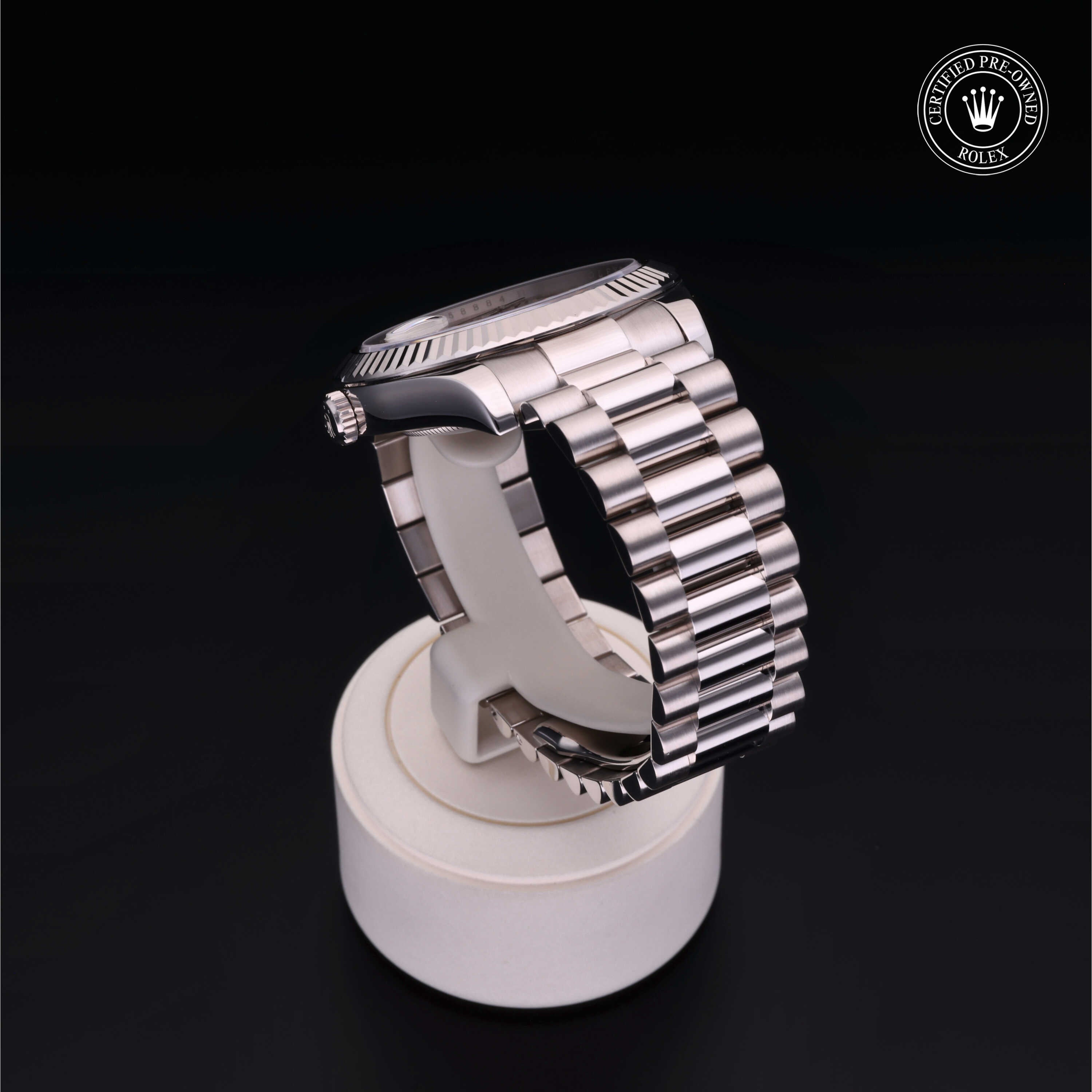 The Oyster Perpetual Day-Date, available only in 18 kt gold or 950 platinum, embodies the essence of Rolex prestige and excellence.